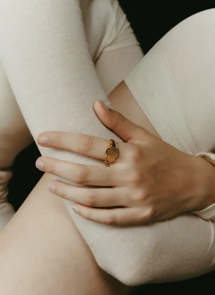 Borrowing the timeless shape of a signet ring, this piece feels like carrying “thoughts” rather than just decoration.